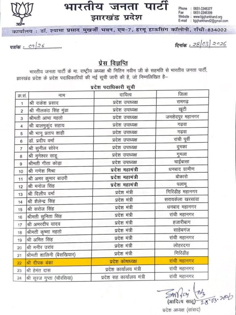 Strengthening its organizational structure, the Bharatiya Janata Party (BJP) Jharkhand has once again expressed confidence in a dedicated party worker by appointing CA Deepak Banka as the State Treasurer for the third consecutive term.